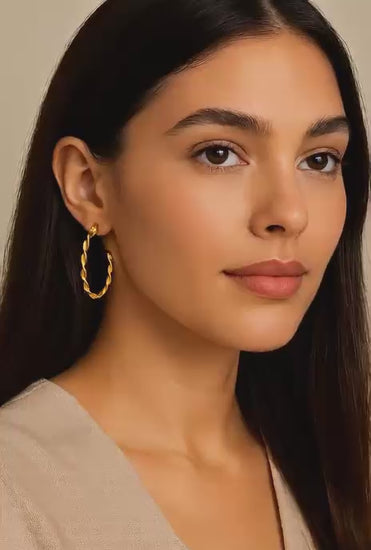 A Argola Folheada a Ouro 18K levemente torcida é a expressão perfeita de elegância com um toque moderno. De alta qualidade, cria um efeito de brilho singular que valoriza o rosto e adiciona sofisticação instantânea a qualquer look — do casual ao mais refinado.