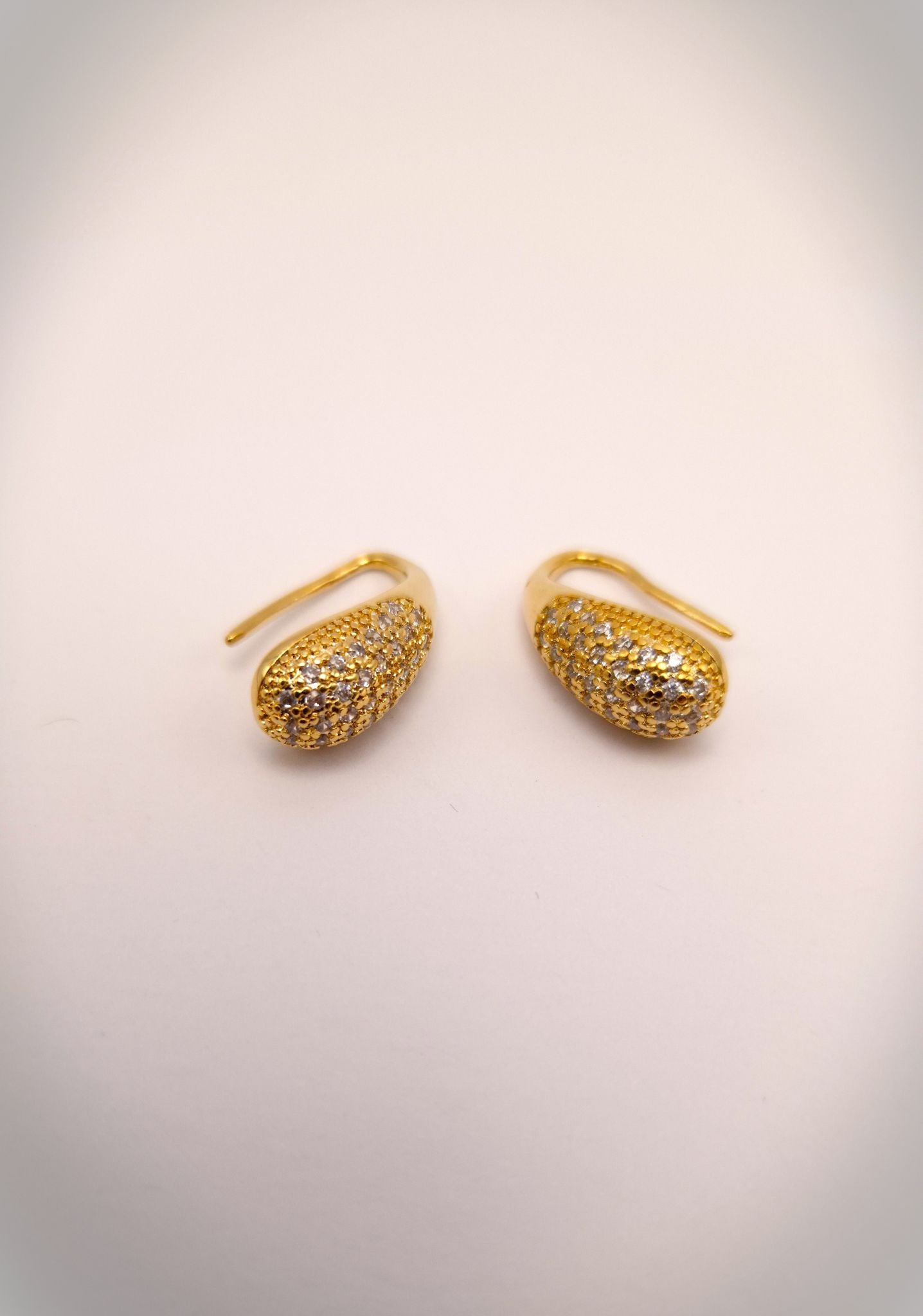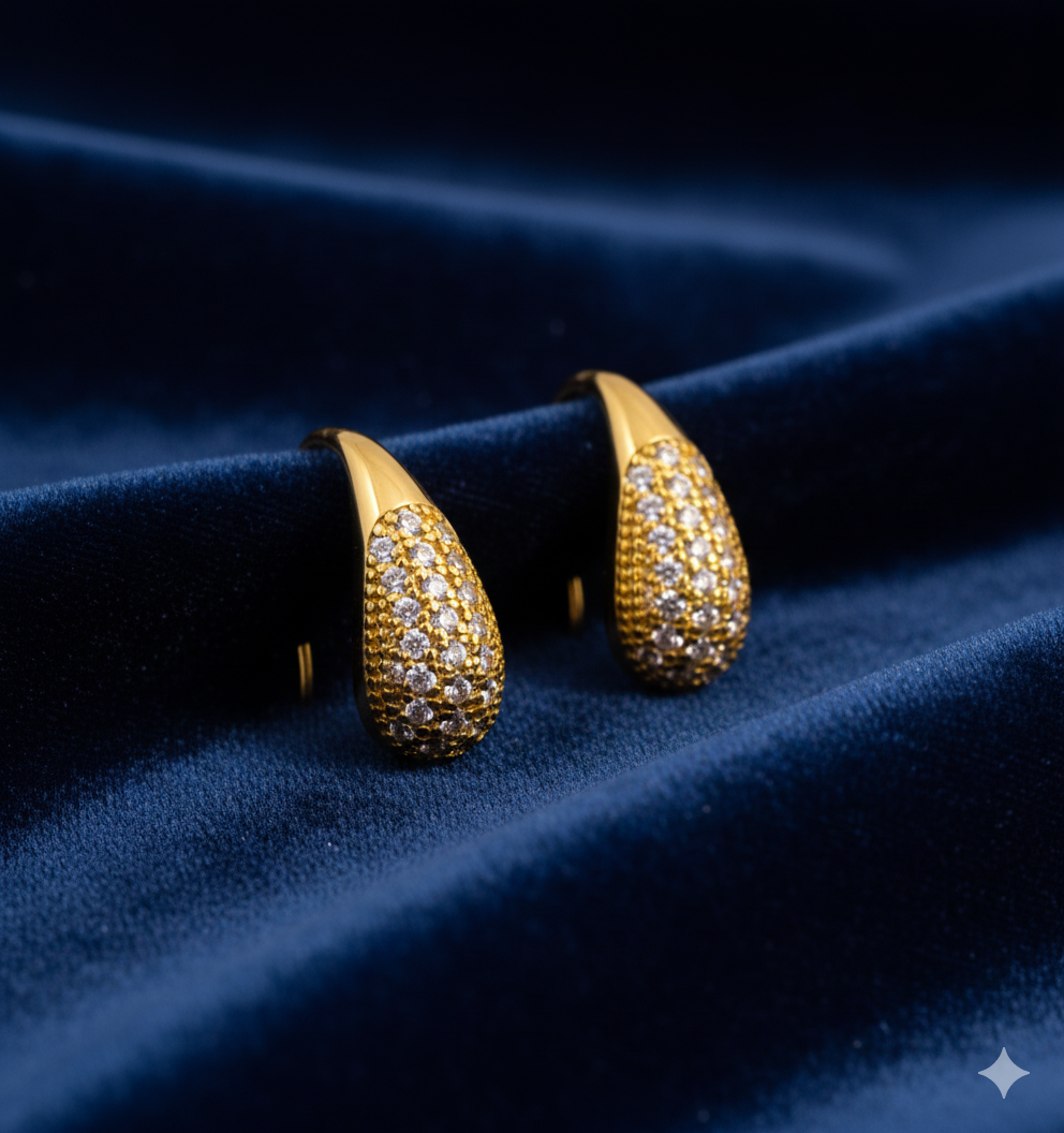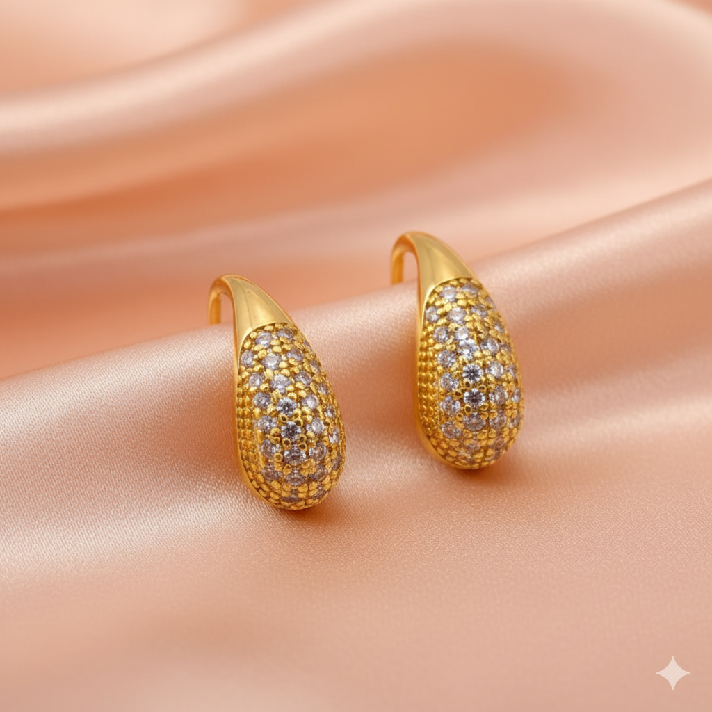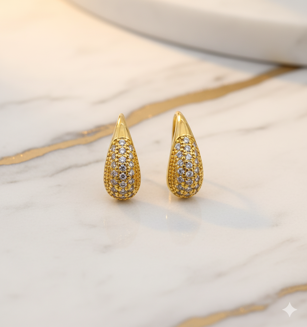 Brilho intenso com toque de delicadeza. Este brinco folheado a ouro em formato de gota é inteiramente cravejado com zircônias cintilantes, refletindo a luz com sofisticação a cada movimento. Seu design curvado e encaixe anatômico garantem conforto e estilo, tornando-o uma peça versátil para diversas ocasiões.