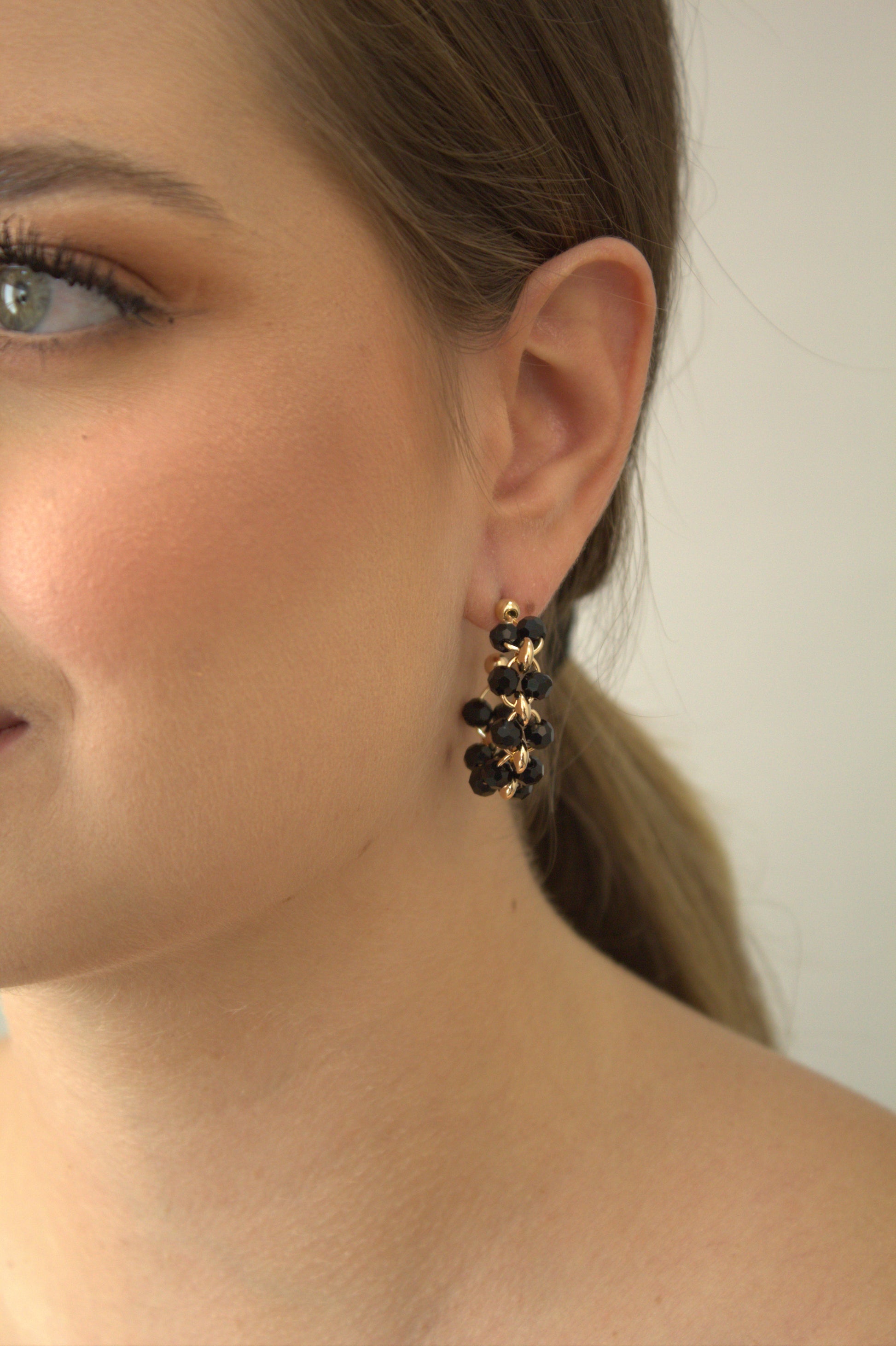 Este brinco folheado a ouro 18k combina o brilho do ouro com o contraste marcante das pedras pretas. As pedras são cuidadosamente fixadas, proporcionando um visual sofisticado e bem-acabado. Com um design equilibrado, esta peça se destaca pela sua versatilidade, podendo ser usada tanto em composições discretas quanto em combinações mais ousadas.