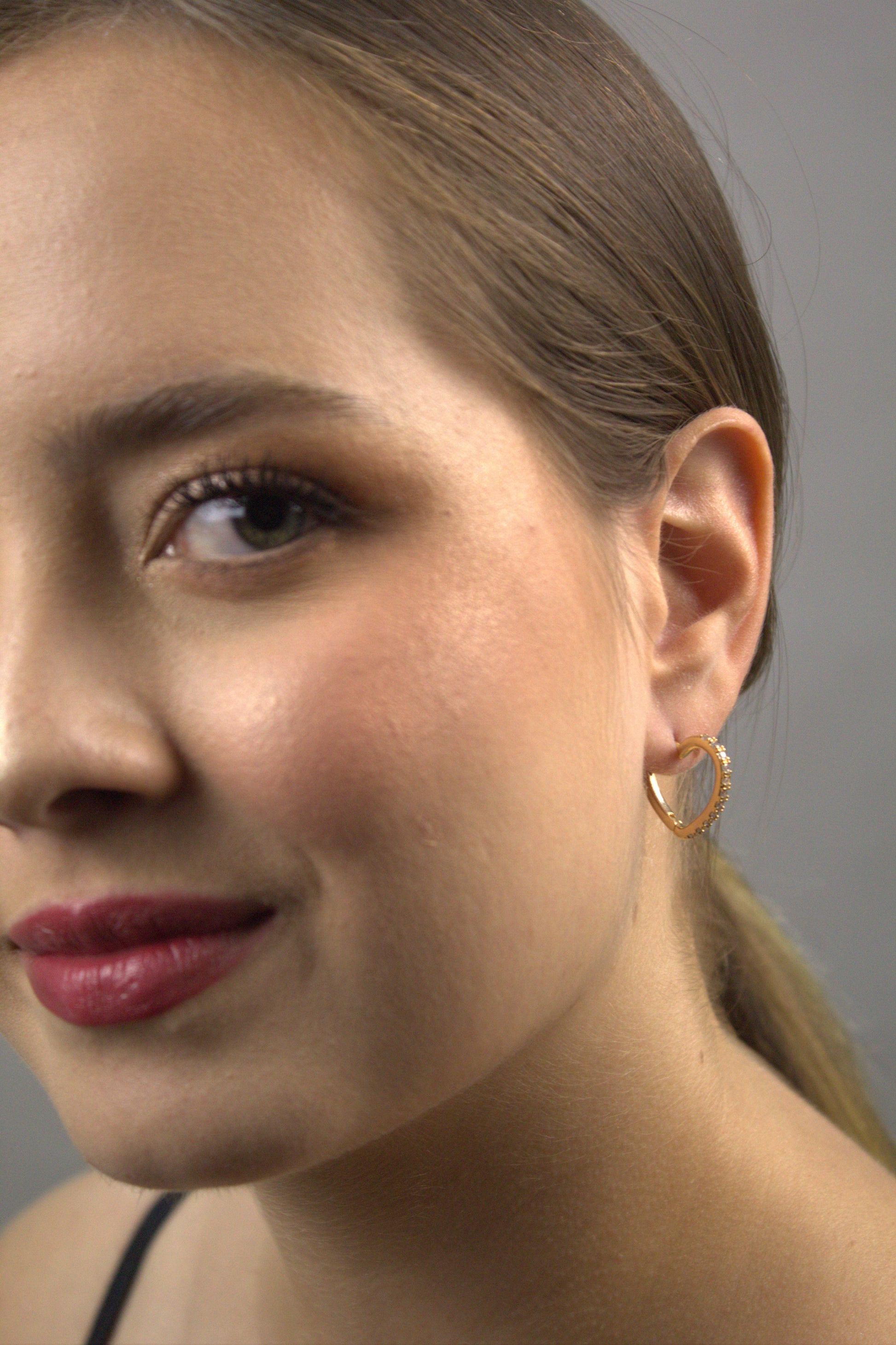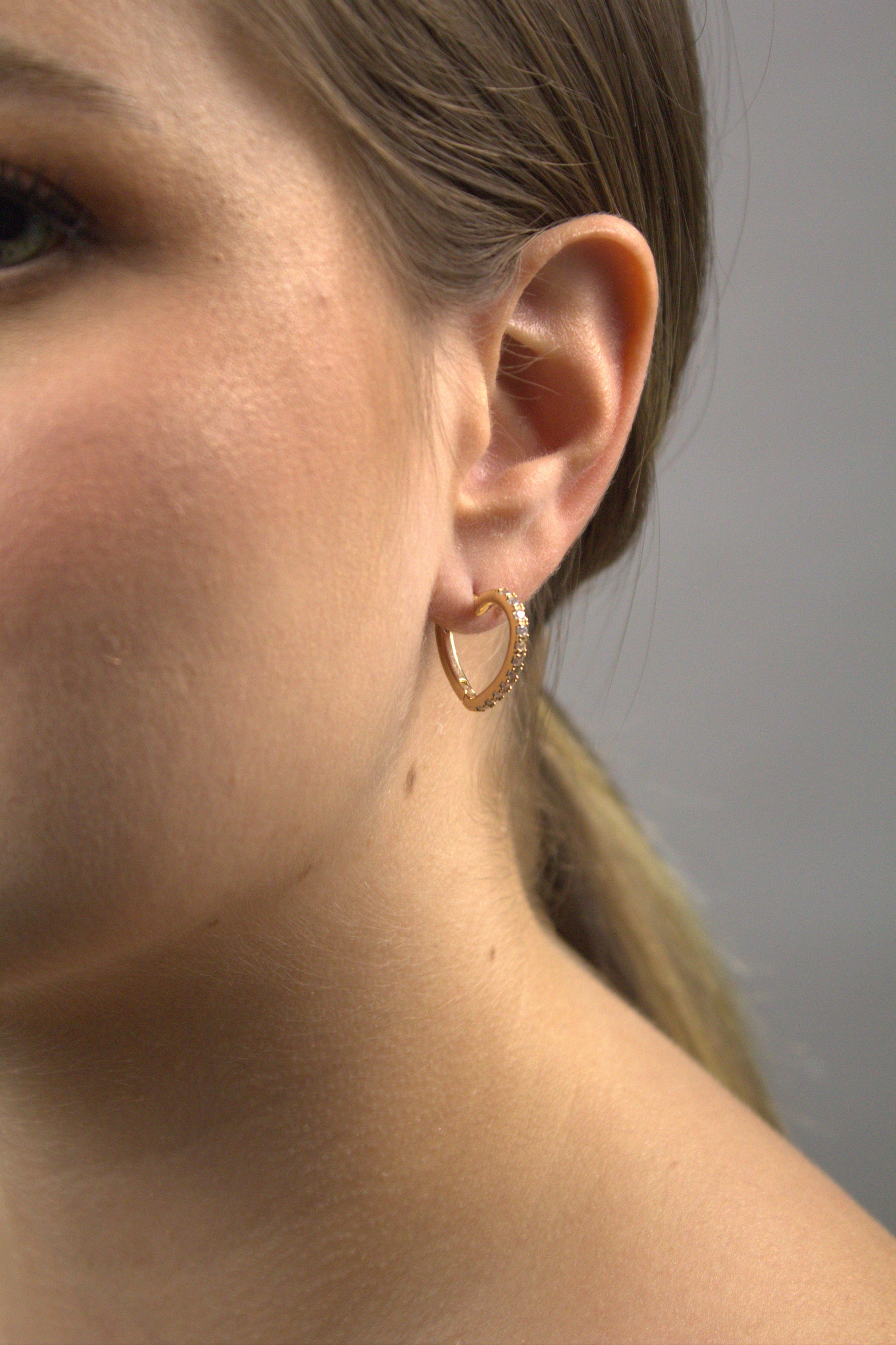 Este brinco folheado a ouro 18k apresenta um design romântico em formato de coração, delicadamente adornado com zircônias que adicionam um brilho encantador. A combinação do ouro com as pedras cria uma peça sofisticada e cheia de charme, perfeita para ocasiões especiais ou para dar um toque de elegância ao seu visual diário.