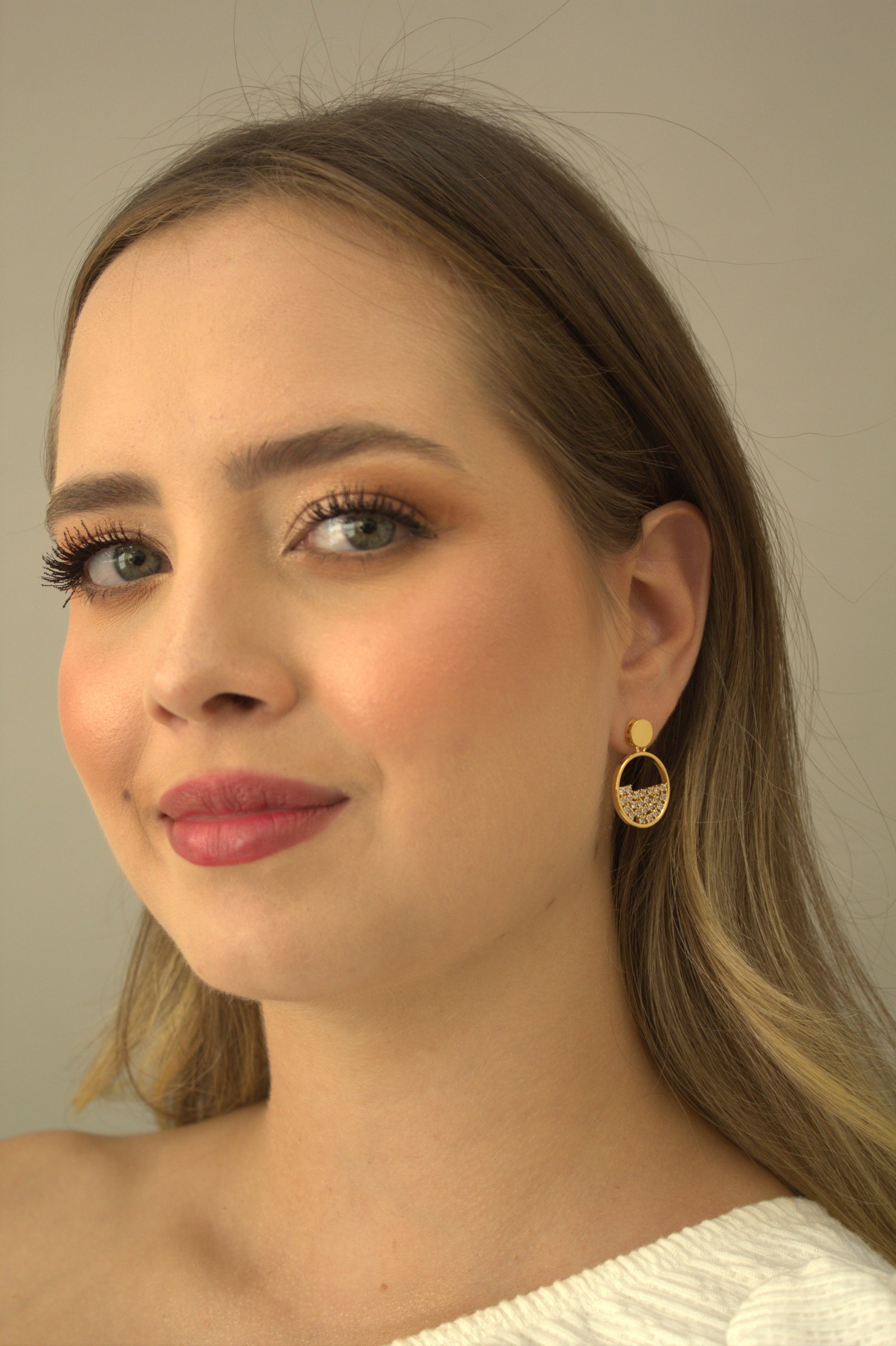 Este brinco combina a elegância do ouro 18k folheado com o brilho sutil das zircônias. Seu design apresenta um círculo vazado que confere leveza à peça, enquanto as aplicações de zircônias adicionam um toque de sofisticação. Leve e confortável, é um acessório ideal para diversas ocasiões.