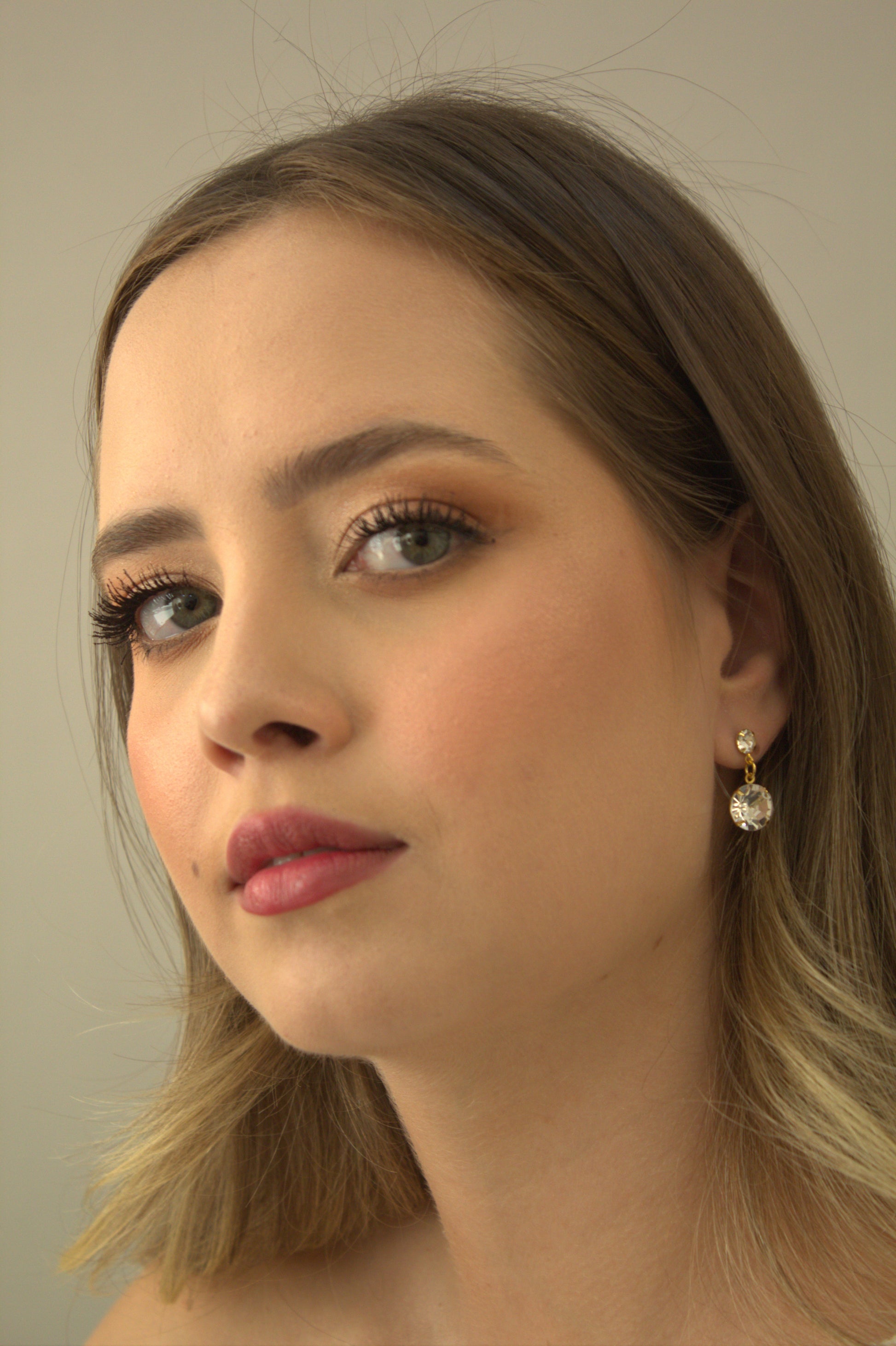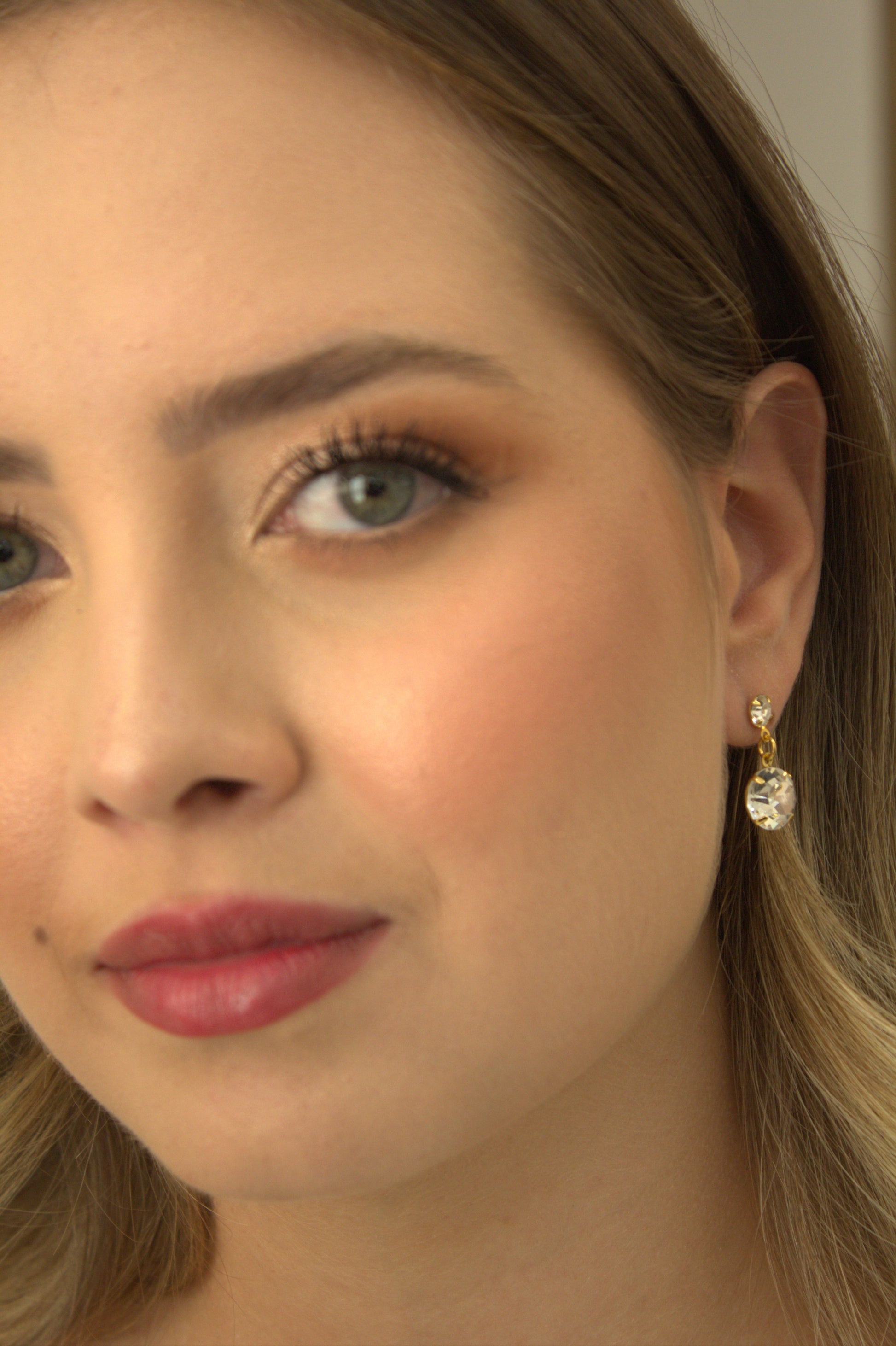 Este brinco apresenta um design sofisticado, com uma pedra cristal translúcida que se destaca na base dourada folheada a ouro 18k. O formato pendurado adiciona movimento à peça, realçando seu brilho e elegância. Leve e confortável, é uma escolha versátil para diferentes ocasiões.
