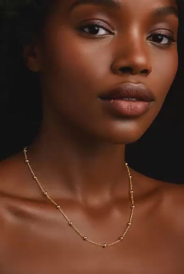 Delicada e marcante, gargantilha de bolinha banhada a ouro 18K é a escolha perfeita para quem busca sofisticação com um toque moderno. Dispostas em harmonia ao longo dos 35 cm de comprimento, refletem a luz com suavidade, destacando o colo com elegância e charme.
